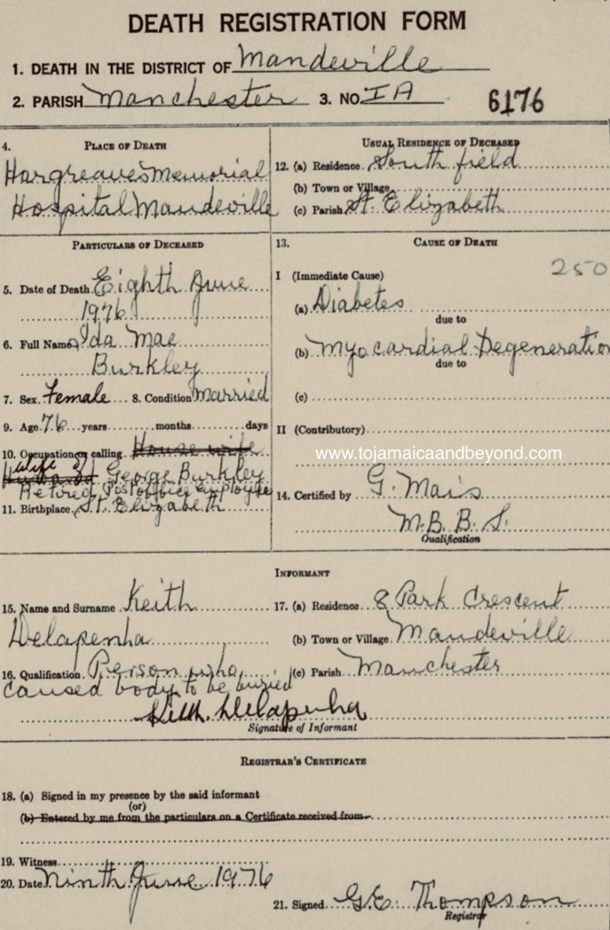 MANDEVILLE, MANCHESTER, JAMAICA: Mae, who suffered with diabetes, was living at Southfield Pen Great House when she became ill. On the 8th June, 1976, just 5 years after her son’s death, she died at Hargreaves Memorial Hospital in Mandeville. The cause of death being diabetes, attributed to Myocardial Degeneration (see article)