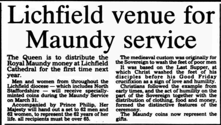 So after being selected by Buckingham Palace, Lichfield Cathedral was officially announced and unveiled in the media to be the venue for the next annual Royal Maundy Service, which was due to take place just five months later in the March of 1988.