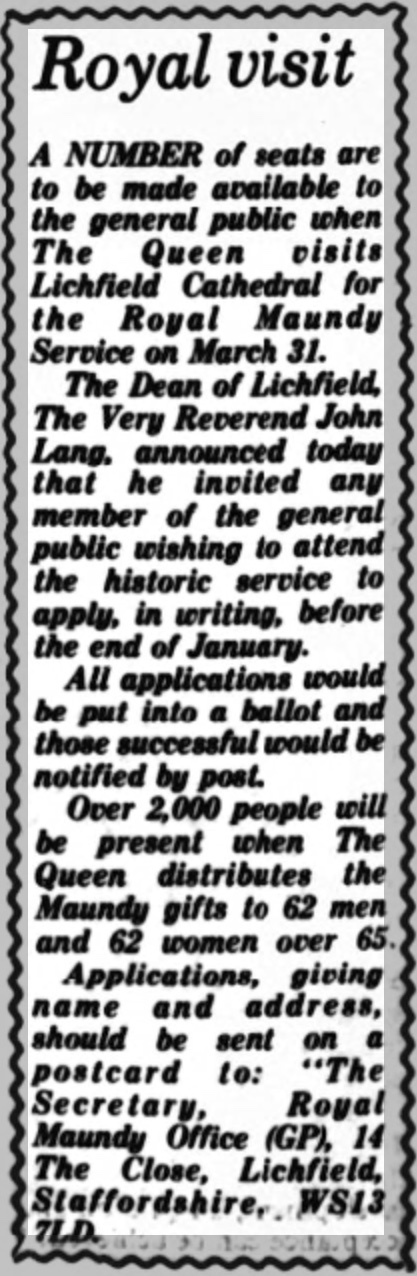 All 124 Recipientβs were invited and βadvisedβ to attend Lichfield Cathedral for a βPre-Maundy Lectureβ at 3.30 p.m on Saturday 12th March 1988. This Special Lecture was to be performed by the outgoing Bishop of Rochester, who was retiring after many years of Service. Members of the Public could also attend, free of charge.