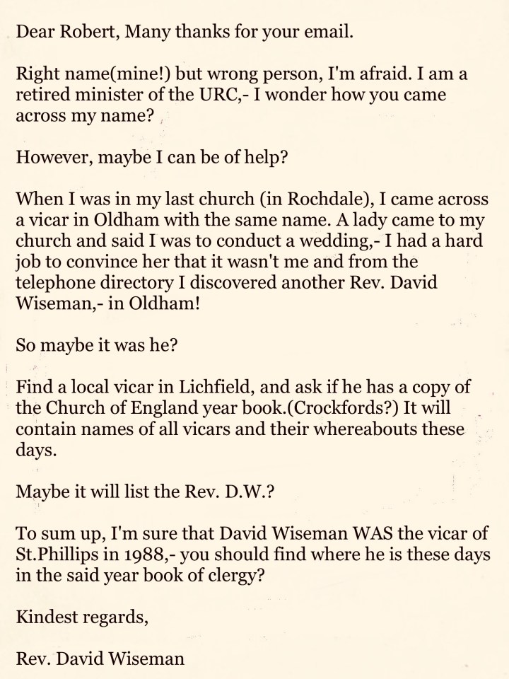 I asked him if he knew what had happened to Rev. David Wiseman, the man who had been the Vicar of the Church during the Maundy years, telling him that it was my quest to try and make contact with him.
