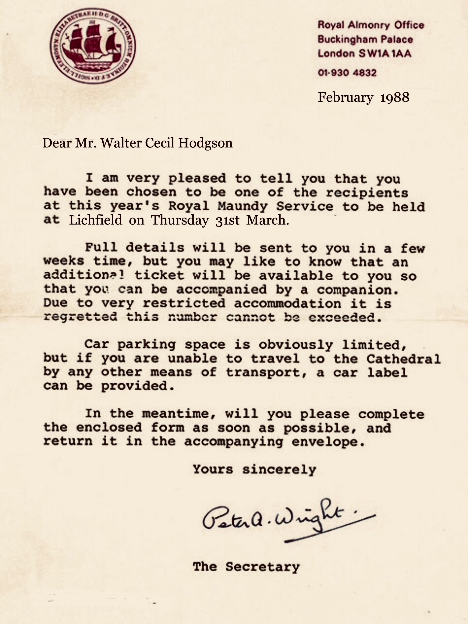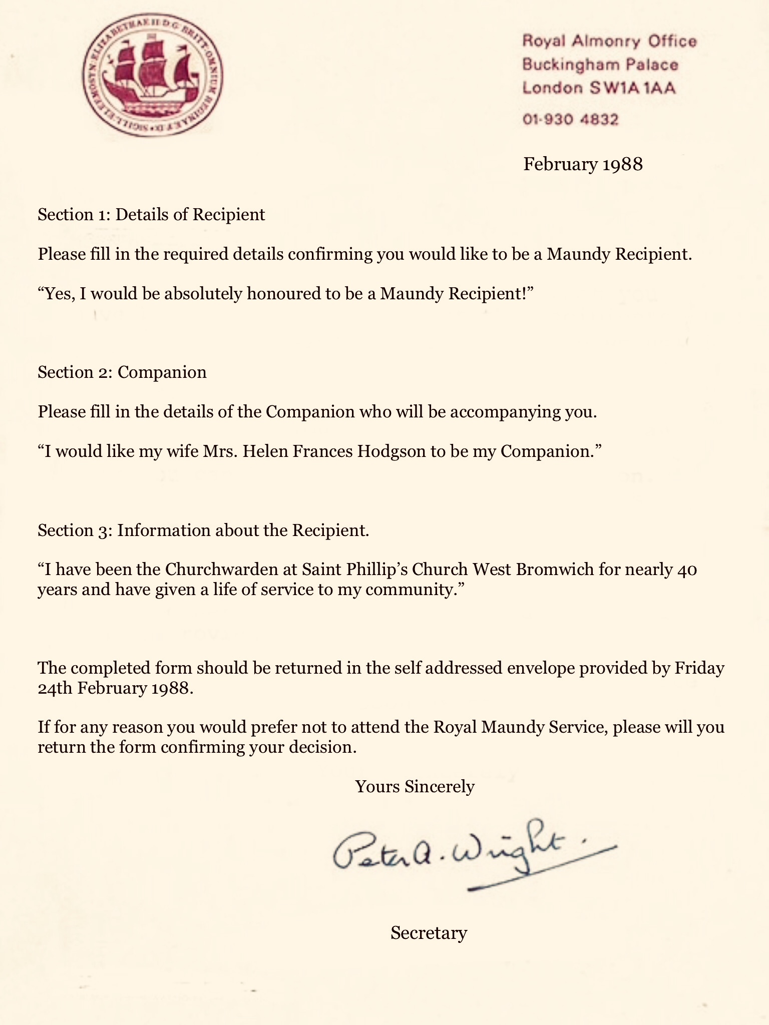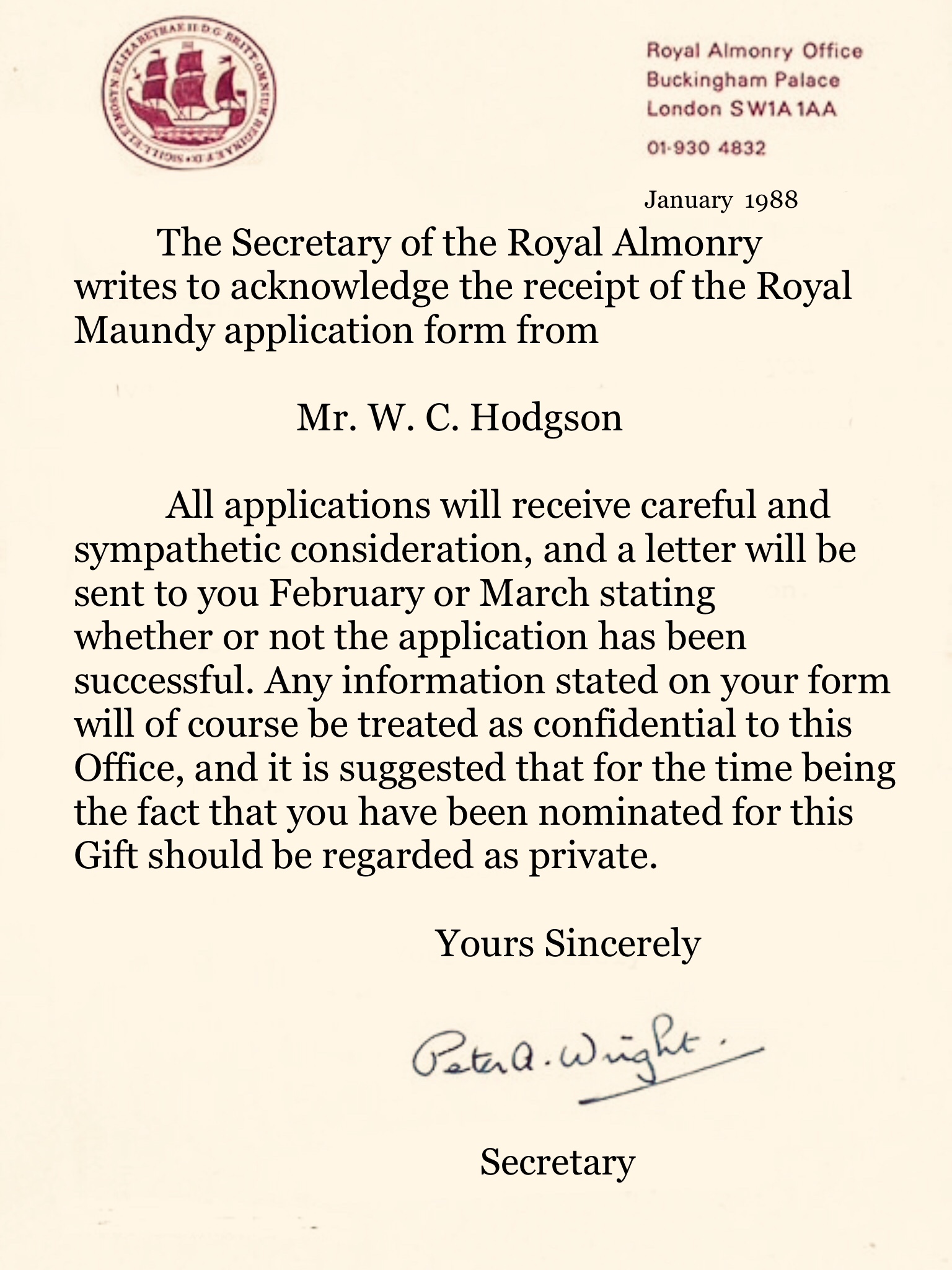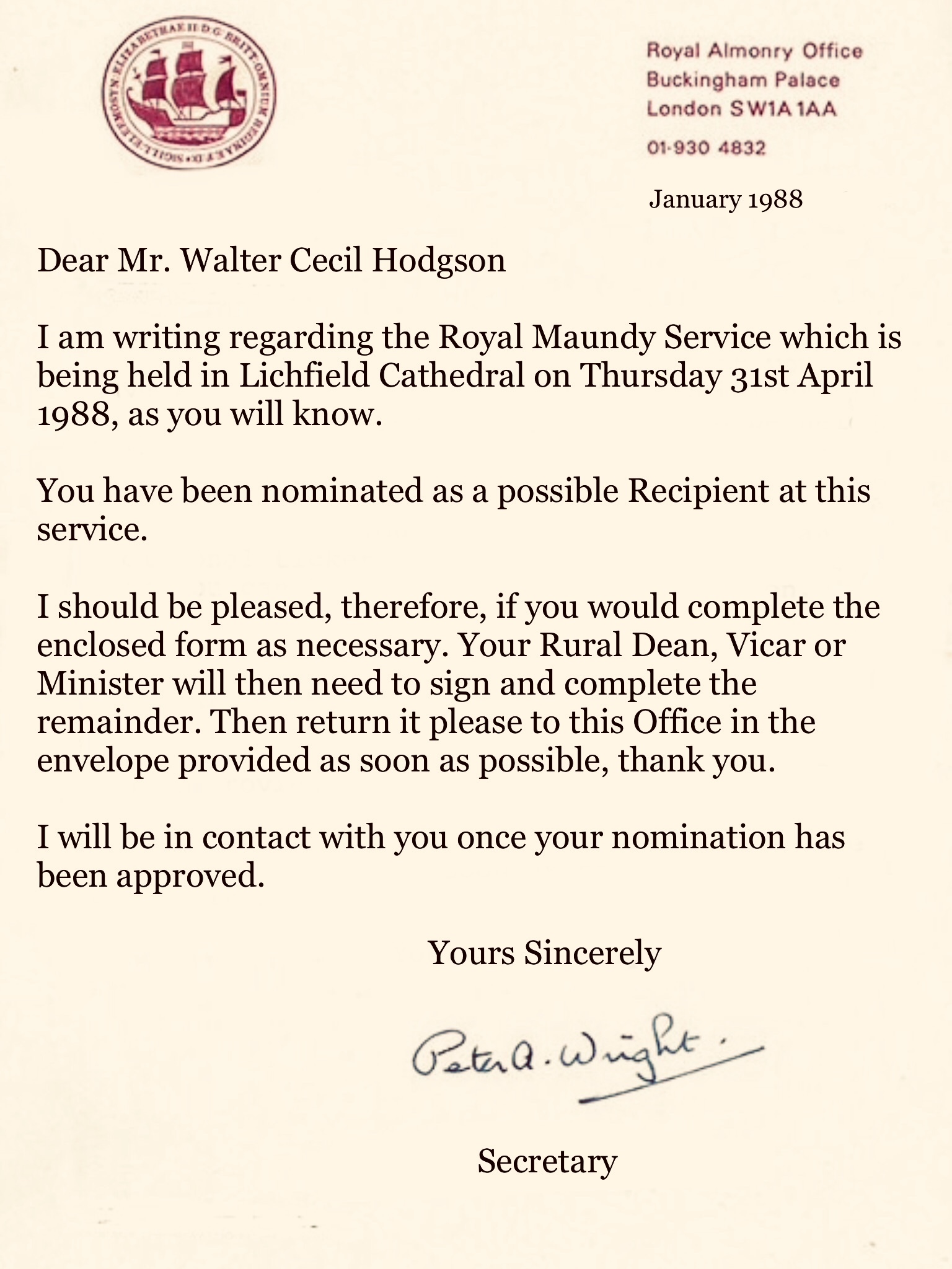 After Cecil had completed Royal Maundy application form, he then sent it off to the Royal Almonry Office. The Secretary Peter Wright, wrote back, confirming that he had received Cecilβs application form.