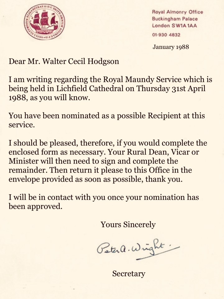 Rev. Lang duly accepted Rev. Wisemanβs written recommendations of Cecil Hodgson, then either he or the Bishop of Lichfield – Iβm not quite sure who – officially nominated him as a βpotential Royal Maundy Recipientβ posting his nomination details off to the Royal Almonry Office, Buckingham Palace.
