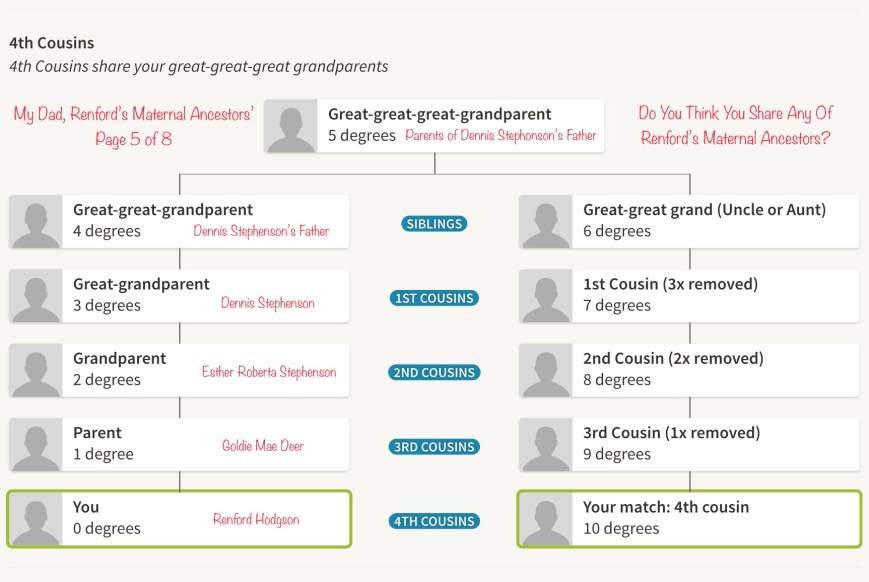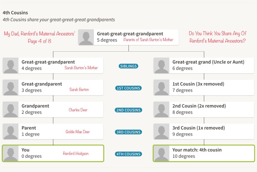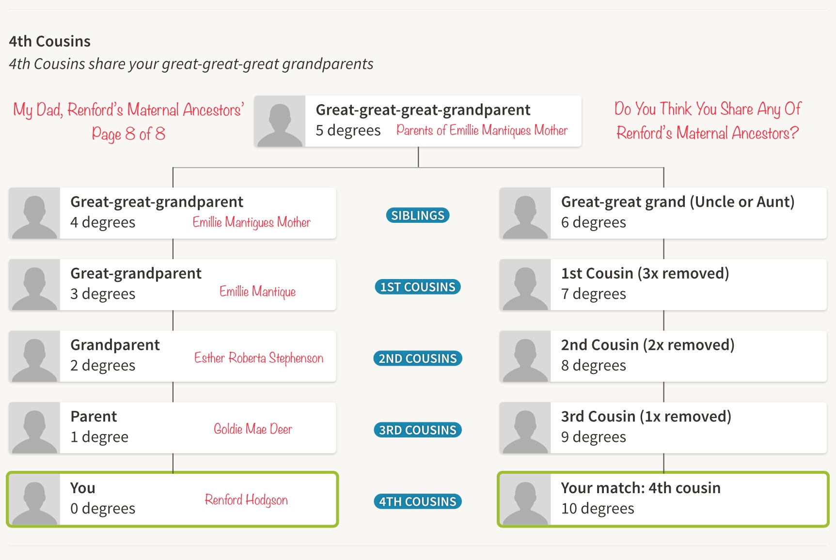 I have only shown 4th cousin type tables going up to his great great great grandparents, in order to show you a larger quantity of his ancestors. You may in fact be a closer match – 1st, 2nd or 3rd cousin. (See DNA Cases Solved)