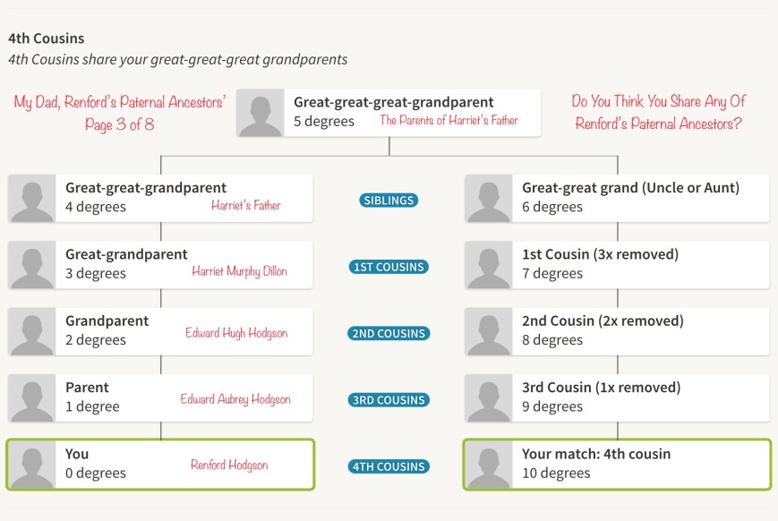 To investigate if we are linked down my dad’s side, this is the page to check. The first 8 tables go down the ‘paternal side’ of his father, Edward Aubrey Hodgson.